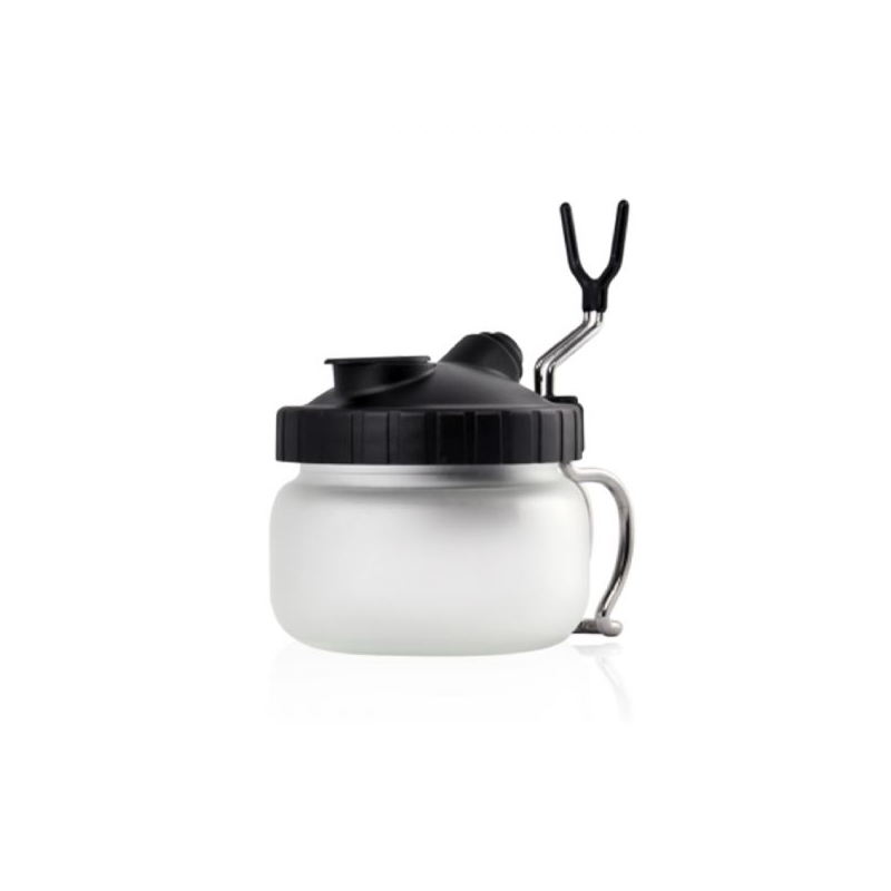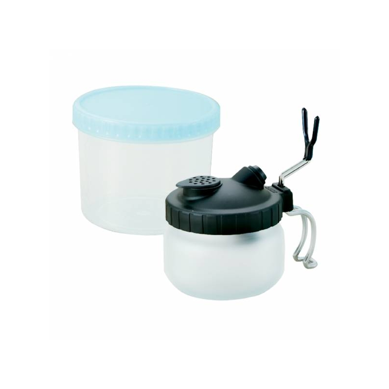 一種清潔噴槍的新穎而輕鬆的方法。 同時可以當作噴筆架,並讓使用者通過將多餘的顏色噴入罐子中來清潔他們的噴筆,不會過度噴塗。 使用後只需沖洗罐子即可。 包裝在 700 cc 保護性塑膠容器內,可在不使用時用於存放漆料.